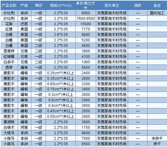 東南亞緬甸木材市場表現(xiàn)依舊平穩(wěn)。據(jù)商家反映,緬甸材新貨尚未入市,現(xiàn)階段緬甸材依舊面臨著貨源緊缺的局面,而且由于市場不確定因素較多,加之商家并不清楚上游的新貨供應(yīng)情況。在這種情形下,市場有訂單商家也不敢輕易接收。價(jià)格方面,近期緬甸材價(jià)格基本維持平穩(wěn)。 拐棗行情驟然走好。沉寂了將近兩年的拐棗在近期走勢突然好轉(zhuǎn),出貨量迅速攀升。據(jù)商家反映,甚至有不少天津、四川等地的采購商還專門跑來廣州尋貨。不過由于之前拐棗的行情過于低迷商家備貨不多,因此導(dǎo)致市場拐棗的貨源持續(xù)處于緊缺的狀態(tài)。目前廣東市場拐棗長2.2—2.6m、厚5cm、A級(jí)報(bào)價(jià)5600—5800元/立方米。 卡絲拉貨源持續(xù)緊缺。據(jù) 商家反映,經(jīng)過長時(shí)間的消耗,加之市場缺乏新貨補(bǔ)充,目前卡絲拉貨源持續(xù)緊缺。另外,商家同時(shí)反映,以前卡絲拉主要用于制作木門居多,而家具方面涉及相對(duì) 較少,不過現(xiàn)在情況有所改變了,有不少家具商家開始將卡絲拉用于家具方面,卡絲拉也開始由之前的木門用材為主轉(zhuǎn)變成家具用材為主。目前廣東市場卡絲拉長2.2—2.6m、厚5cm、A級(jí)報(bào)價(jià)4500—4600元/立方米。