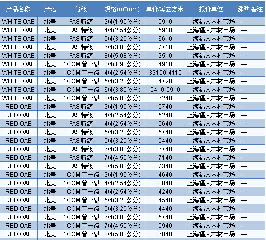 從近期的市場表現(xiàn)來看,北美紅橡、白栓等材種依舊是主流材種,銷量相對較好。目前廣東市場白栓長2.15—3.05m、厚1—2寸、FAS級報價6000—7200元/立方米;白橡長2.15—3.05m、厚1—2寸、FAS級報價8200—13000元/立方米。