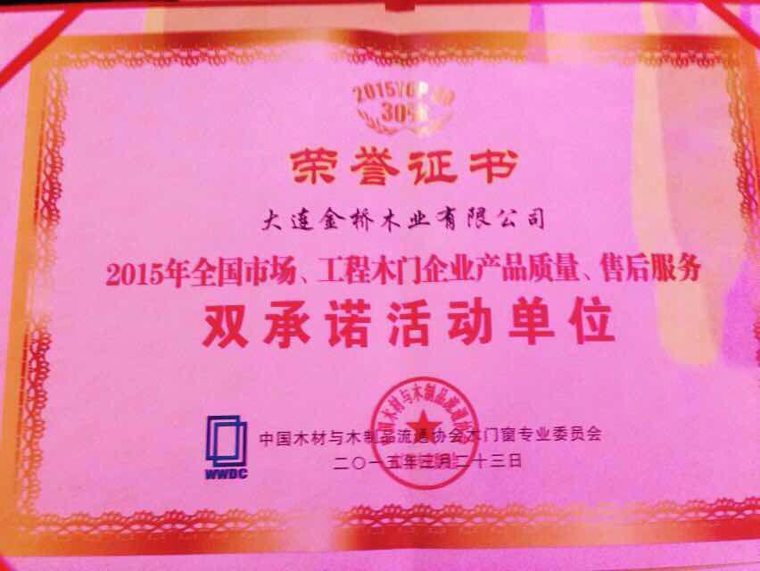 大連金橋木業(yè)有限公司(品橋木門),榮獲中國木材與流通協(xié)會木門企業(yè)產(chǎn)品質(zhì)量、售后服務(wù)雙承諾全國30強企業(yè),新聞發(fā)布會在廣州舉行。