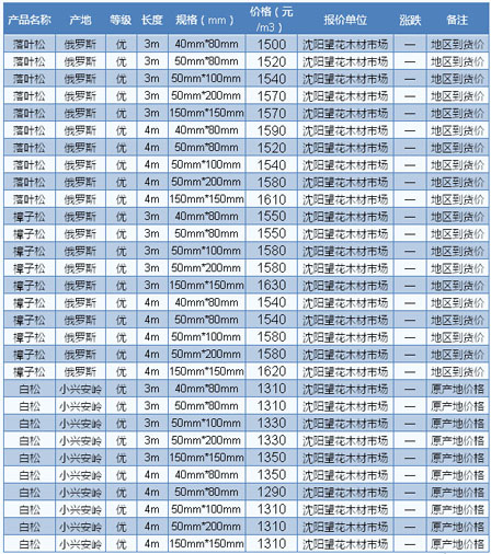 木材市場(chǎng)聯(lián)盟新動(dòng)態(tài):近期,東北鋸材市場(chǎng)冷清不堪,行情弱勢(shì)整理。據(jù)商家反映,下游市場(chǎng)需求一片慘淡,大多數(shù)商家的庫存遲遲難以有效消耗,即使是降價(jià)出貨,尋貨問價(jià)者依然寥寥無幾。在眾多東北材品種當(dāng)中,松木類材種走勢(shì)相對(duì)較好,特別是用于基礎(chǔ)建筑方面的材料,市場(chǎng)依然能維持一定的出貨量。不過有商家反映,東北松木材種使用比較 集中的地區(qū)主要在北方地區(qū),如華北、東北、西北等地區(qū),而華南地區(qū)的需求量則相對(duì)較少,原因主要是華南地區(qū)距離較為遙遠(yuǎn),運(yùn)輸成本過大,導(dǎo)致東北松木缺乏 性價(jià)比。目前山東德州落葉松規(guī)格4m×6cm×12cm報(bào)價(jià)1700元/立方米。