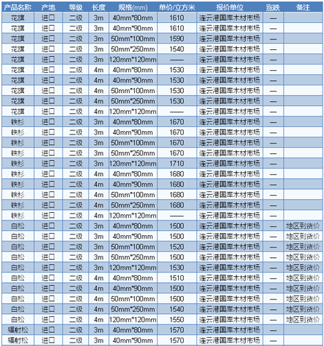 木材市場聯盟新動態(tài):近期,因加拿大爆發(fā)森林大火,使得北美木材市場行情略顯震蕩,軟木方面表現得尤為明顯。據商家反映,受到多方面因素的影響,目前北美材的價格處于高位,且還有繼續(xù)上升的跡象。同時,雖然國內市場目前形勢略顯偏空,軟木的需求量較往年同期明顯萎縮,但畢竟剛性需求依然還在,國內市場對北美軟木的需求量依然相當 龐大,例如廣東市場,每個月的需求量就已經將近幾萬個立方米,此外福建漳州等建筑模板廠家對北美軟木的需求量也不可小覷??梢钥闯?,北美軟木的后市行情仍 然相當看好。目前廣東市場北美花旗松長2—4m、A級加工統(tǒng)材報價1340元/立方米;南方松2—4m、A級加工統(tǒng)材報價1360元/立方米。
