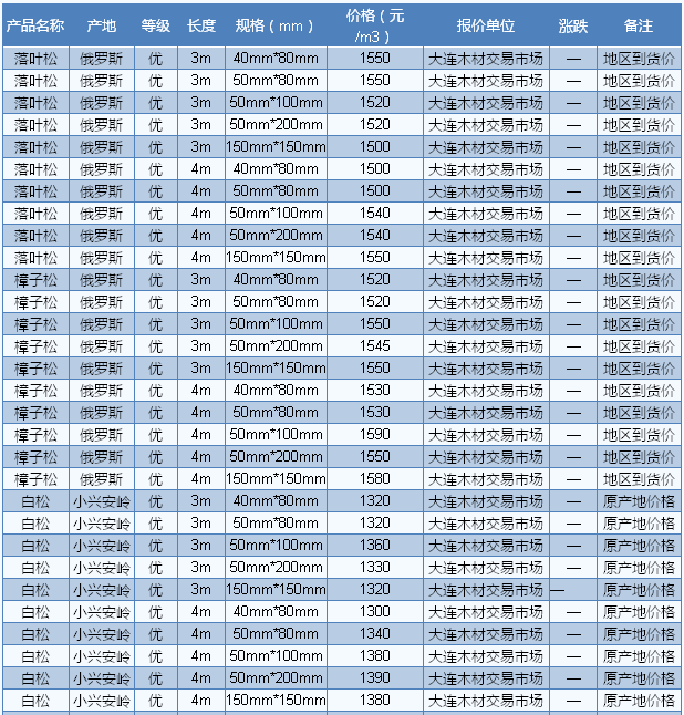 木材市場聯(lián)盟新動態(tài):近期滿洲里口岸針葉材市場表現(xiàn)平穩(wěn),量價波動甚少。目前滿洲里落葉松原木直徑28cm、長6m、產(chǎn)地伊爾庫報(bào)860元/立方米,直徑29cm、長6m、產(chǎn)地克市報(bào)930元/立方米,樟子松直徑24cm、長4m、產(chǎn)地布拉斯克報(bào)740元/立方米。