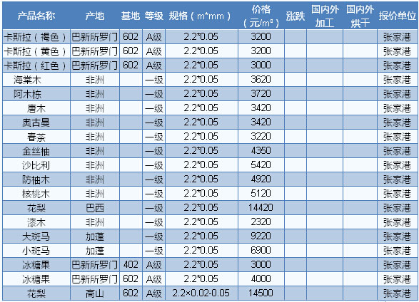 木材市場聯(lián)盟新動(dòng)態(tài):隨著市場活躍度的不斷提升,近期張家港巴新材、所羅門材價(jià)格有所上漲,漲幅普遍在100-300元/立方米。目 目前張家港冰糖果(海棠)1800-2200元/立方米,阿摩楝 1600-1900元/立方米,山檨?zhàn)?200-1300元/立方米,山桂花 1500-1700元/立方米,翅蘋婆 1100-1300元/立方米,欖仁 1600-1800元/立方米,米籽蘭 1500-1700元/立方米。
