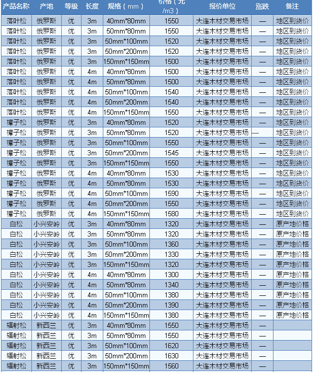 立方米。其他材種如俄羅斯樺木,長2—4m、厚5cm、統(tǒng)材報(bào)價(jià)為2400—2600元/立方米。