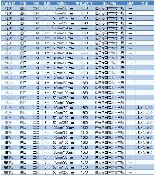 木材市場聯(lián)盟新動態(tài):近期,因加拿大爆發(fā)森林大火,使得北美木材市場行情略顯震蕩,軟木方面表現(xiàn)得尤為明顯。據(jù)商家反映,受到多方面因素的影響,目前北美材的價格處于高位,且還有繼續(xù)上升的跡象。同時,雖然國內(nèi)市場目前形勢略顯偏空,軟木的需求量較往年同期明顯萎縮,但畢竟剛性需求依然還在,國內(nèi)市場對北美軟木的需求量依然相當 龐大,例如廣東市場,每個月的需求量就已經(jīng)將近幾萬個立方米,此外福建漳州等建筑模板廠家對北美軟木的需求量也不可小覷??梢钥闯觯泵儡浤镜暮笫行星槿? 然相當看好。目前廣東市場北美花旗松長2—4m、A級加工統(tǒng)材報價1340元/立方米;南方松2—4m、A級加工統(tǒng)材報價1360元/立方米。