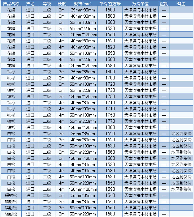 然相當(dāng)看好。目前廣東市場(chǎng)北美花旗松長(zhǎng)2—4m、A級(jí)加工統(tǒng)材報(bào)價(jià)1340元/立方米;南方松2—4m、A級(jí)加工統(tǒng)材報(bào)價(jià)1360元/立方米。