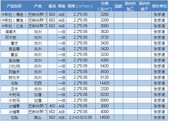 木材市場聯(lián)盟新動態(tài):隨著市場活躍度的不斷提升,近期張家港巴新材、所羅門材價格有所上漲,漲幅普遍在100-300元/立方米。目前張家港冰糖果(海棠)1800-2200元/立方米,阿摩楝 1600-1900元/立方米,山檨子1200-1300元/立方米,山桂花 1500-1700元/立方米,翅蘋婆 1100-1300元/立方米,欖仁 1600-1800元/立方米,米籽蘭 1500-1700元/立方米。