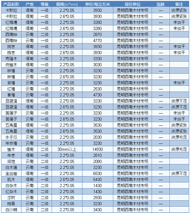 木材市場聯(lián)盟新動態(tài):拐棗、克隆市場基本無人問津。目前廣東市場拐棗長2.2—2.6m、厚5cm、A級報價6000—6300元/立方米;克隆長2.2—2.6m、厚5cm、A級報價4100—4300元/立方米。