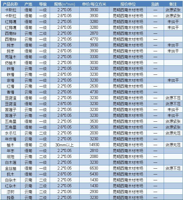 木材市場聯(lián)盟新動(dòng)態(tài):金絲柚市場無表現(xiàn)。價(jià)格持續(xù)高位不跌的金絲柚難以受到下游工廠的青睞,出貨量寥寥無幾,行情難言樂觀。目前廣東市場金絲柚長2.2—2.6m、厚5cm、A級(jí)報(bào)價(jià)6800—7200元/立方米。