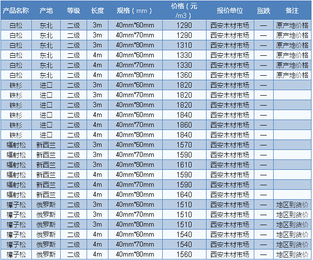 木材市場(chǎng)聯(lián)盟新動(dòng)態(tài):7月份綏芬河口岸樟子松原木選材價(jià)格報(bào)900元/立方米,一二等材760元/立方米,三等材680元/立方米;落葉松原木選材830元/立方米,選材760 元/立方米,三等材680元/立方米;落葉松原木直徑14-20cm、一等材750元/立方米,一二等材720元/立方米,三等材680元/立方米;白松 原木一二等材760元/立方米、三等材710元/立方米。