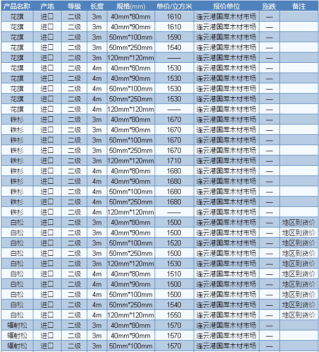 木材市場聯(lián)盟新動態(tài):受到人民幣貶值的影響,繼闊葉材價格的上漲之后,近段時間軟木的價格也開始逐步拉升。據(jù)商家反映,近期北美軟木建筑用材的價格普遍上漲20-30元/立方米左右。不過,在需求面上,商家表示目前正處于淡季時期,即使價格上漲了,但下游市場的需求量仍然十分冷清,行情整體偏淡。目前廣東市場美國黃松長2— 4m、A級統(tǒng)材加工報收1360元/立方米;美國鐵杉長2—4m、A級統(tǒng)材加工報收1340元/立方米;南方松長2—4m、A級統(tǒng)材加工報收1360元 /立方米。