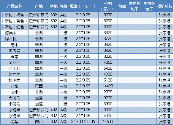木材市場(chǎng)聯(lián)盟新動(dòng)態(tài):7月下旬,所羅門材大批量的到貨,如唐木、欖仁等品種,庫(kù)存總量會(huì)有所飆升。小斑馬越來(lái)越受到下游家具商家的青睞,市場(chǎng)出貨量表現(xiàn)相當(dāng)突出。之后,行情一直持續(xù)到現(xiàn)在,總體出貨量非??捎^,即使是目前處于淡季時(shí)期,小斑馬仍然能保持住一定的出貨量。目前張家港市場(chǎng)小斑馬板材5公分厚、統(tǒng)貨報(bào)價(jià)5500— 6500元/立方米。