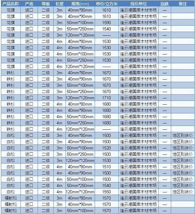 木材市場聯(lián)盟新動(dòng)態(tài):受到人民幣貶值的影響,繼闊葉材價(jià)格的上漲之后,近段時(shí)間軟木的價(jià)格也開始逐步拉升。據(jù)商家反映,近期北美軟木建筑用材的價(jià)格普遍上漲20-30元/立方米左右。不過,在需求面上,商家表示目前正處于淡季時(shí)期,即使價(jià)格上漲了,但下游市場的需求量仍然十分冷清,行情整體偏淡。目前廣東市場美國黃松長2— 4m、A級(jí)統(tǒng)材加工報(bào)收1360元/立方米;美國鐵杉長2—4m、A級(jí)統(tǒng)材加工報(bào)收1340元/立方米;南方松長2—4m、A級(jí)統(tǒng)材加工報(bào)收1360元 /立方米。