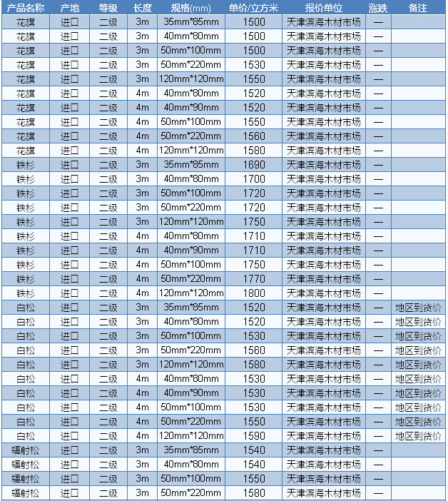 木材市場聯(lián)盟新動(dòng)態(tài):近期,北美木材市場繼續(xù)維持平穩(wěn)的態(tài)勢,各種類品種出貨量較之前基本相當(dāng)。其中,軟木在戶外工程建設(shè)進(jìn)展緩慢的拖累下,市場成交量谷底徘徊。不過,經(jīng)銷商對軟木的后市仍然較為看好,預(yù)計(jì)在進(jìn)入九月份之后軟木市場將會(huì)有不俗的表現(xiàn)。目前廣東市場美國黃松長2—4m、A級統(tǒng)材加工報(bào)價(jià)1360元/立方米;北美花 旗松長2—4m、A級統(tǒng)材加工報(bào)價(jià)1340元/立方米。