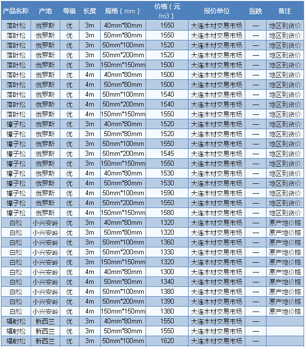 元/立方米,三等材680元/立方米;落葉松原木直徑14-20cm、一等材750元/立方米,一二等材720元/立方米,三等材680元/立方米;白松