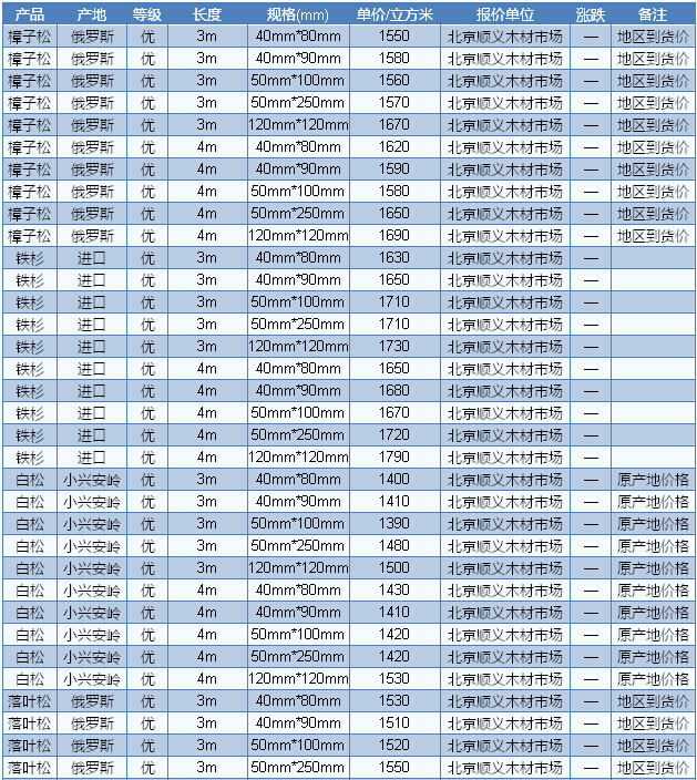 目前廣東木材市場白松長2—4m、厚2.5—9cm、統(tǒng)材報價1700—2000元/立方米、樟子松長2—4m、厚5cm、統(tǒng)材報價2100—2200元/立方米。