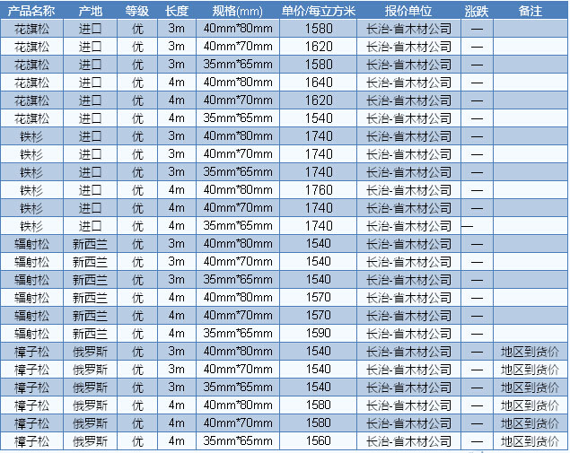 2016年8月9日長治木材市場方木價格
