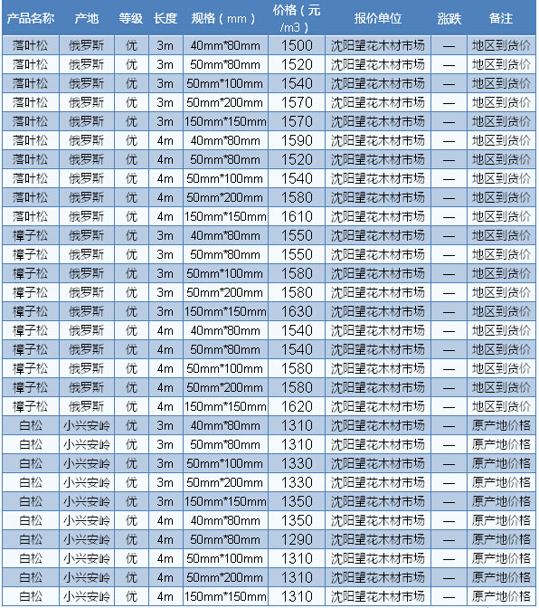 目前廣東木材市場(chǎng)白松長(zhǎng)2—4m、厚2.5—9cm、統(tǒng)材報(bào)價(jià)1700—2000元/立方米、樟子松長(zhǎng)2—4m、厚5cm、統(tǒng)材報(bào)價(jià)2100—2200元/立方米。