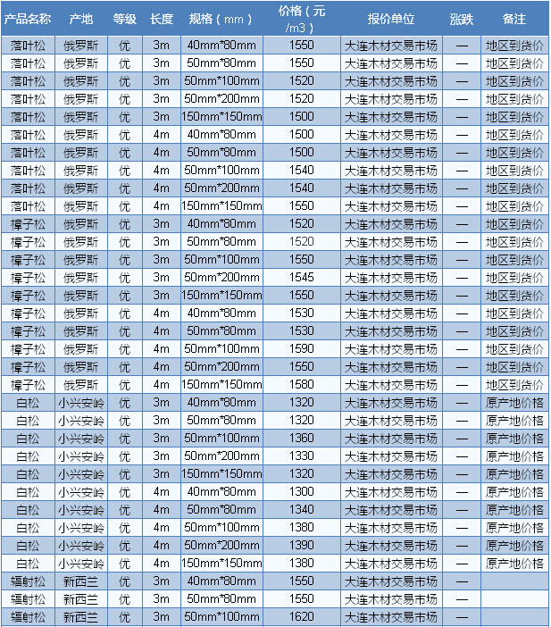2016年8月10日大連木材市場方木價格