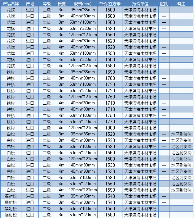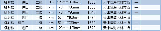 目前廣東木材市場白松長2—4m、厚2.5—9cm、統(tǒng)材報價1700—2000元/立方米、樟子松長2—4m、厚5cm、統(tǒng)材報價2100—2200元/立方米。