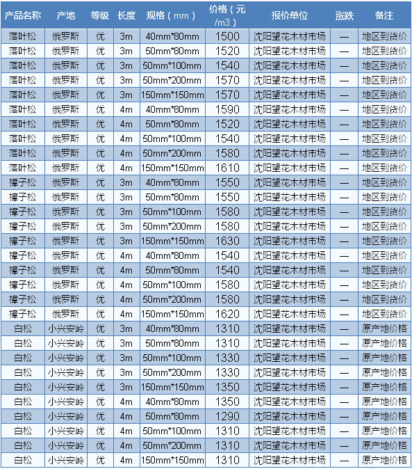 目前廣東木材市場白松長2—4m、厚2.5—9cm、統材報價1700—2000元/立方米、樟子松長2—4m、厚5cm、統材報價2100—2200元/立方米。