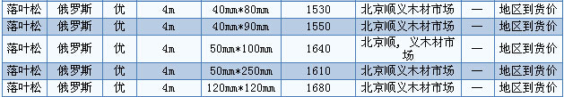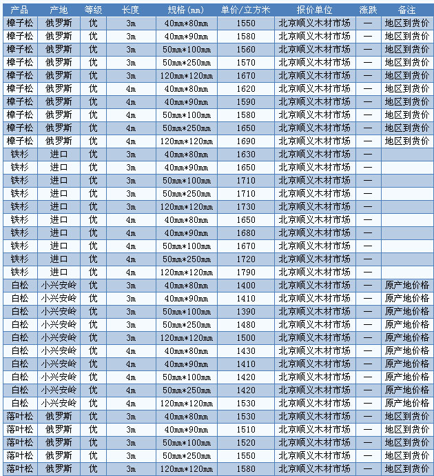 目前廣東木材市場白松長2—4m、厚2.5—9cm、統(tǒng)材報價1700—2000元/立方米、樟子松長2—4m、厚5cm、統(tǒng)材報價2100—2200元/立方米。