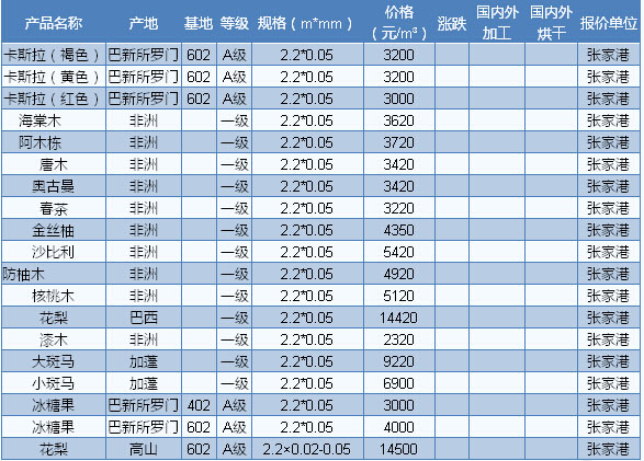 奧古曼鋸材價(jià)格略有回升,漲幅在200—400元/立方米左右。目前廣東市場奧古曼長2—4m、厚5cm、A級(jí)報(bào)價(jià)3700—4200元/立方米。