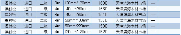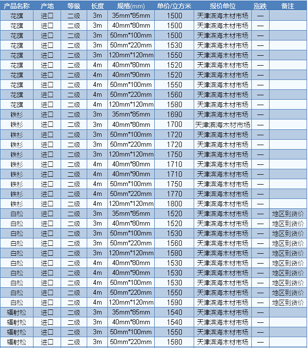 目前廣東木材市場(chǎng)白松長(zhǎng)2—4m、厚2.5—9cm、統(tǒng)材報(bào)價(jià)1700—2000元/立方米、樟子松長(zhǎng)2—4m、厚5cm、統(tǒng)材報(bào)價(jià)2100—2200元/立方米。