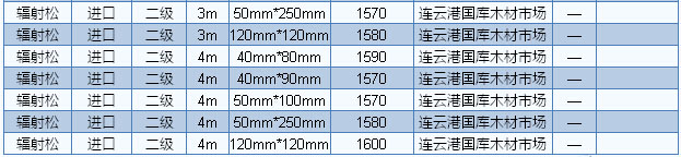 目前廣東木材市場(chǎng)白松長(zhǎng)2—4m、厚2.5—9cm、統(tǒng)材報(bào)價(jià)1700—2000元/立方米、樟子松長(zhǎng)2—4m、厚5cm、統(tǒng)材報(bào)價(jià)2100—2200元/立方米。