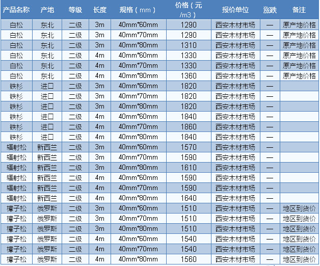 目前廣東木材市場(chǎng)白松長(zhǎng)2—4m、厚2.5—9cm、統(tǒng)材報(bào)價(jià)1700—2000元/立方米、樟子松長(zhǎng)2—4m、厚5cm、統(tǒng)材報(bào)價(jià)2100—2200元/立方米。