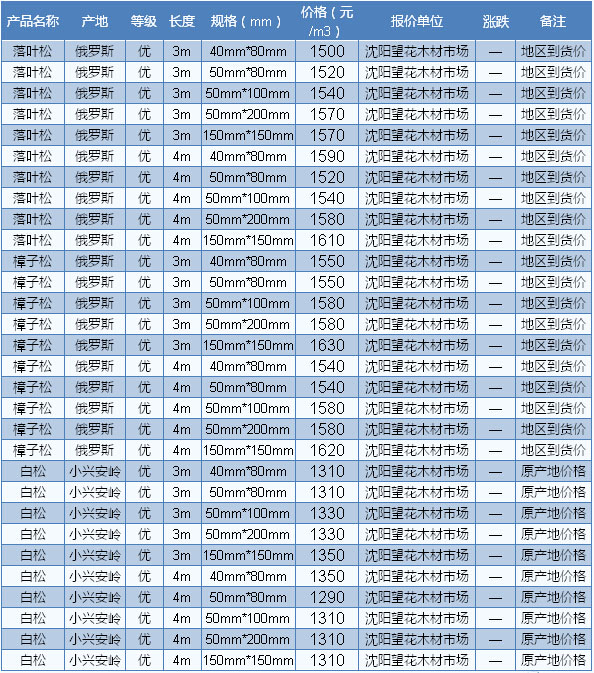 木材市場(chǎng)聯(lián)盟新動(dòng)態(tài):2016 年中國(guó)市場(chǎng)針葉材原木進(jìn)口量大幅增加,而俄羅斯作為中國(guó)木材第一進(jìn)口大國(guó),其原木進(jìn)口量也隨大勢(shì)出現(xiàn)明顯增加??诎秲r(jià)格方面,目前滿洲里白松 14-20cm為650元/方,綏芬河740元/方,太倉(cāng)950元/方。樟子松滿洲里14-20cm為620元/方,綏芬河700元/方,太倉(cāng)28cm以 下820元/方。落葉松滿洲里14-20cm為660元/方,綏芬河700元/方,太倉(cāng)930元/方。