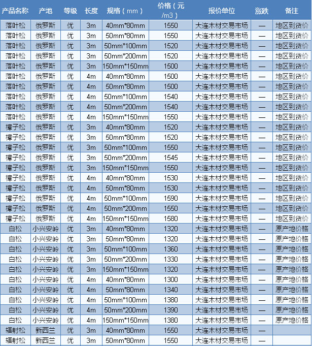 木材市場聯(lián)盟新動態(tài):最新統(tǒng)計數(shù)據(jù)顯示,上半年綏芬河口岸進(jìn)口原木217.5 萬立方米,比上年同期增加15.9%。價格方面,目前樟子松原木選材價格報900元/立方米,一二等材760元/立方米,三等材680元/立方米;落葉松 原木選材830元/立方米,選材760元/立方米,三等材680元/立方米;落葉松原木直徑14-20cm、一等材750元/立方米,一二等材720元 /立方米,三等材680元/立方米;白松原木一二等材760元/立方米、三等材710元/立方米。