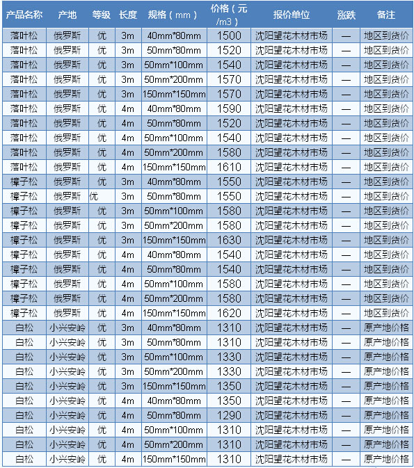 木材市場聯(lián)盟新動態(tài):2016 年中國市場針葉材原木進口量大幅增加,而俄羅斯作為中國木材第一進口大國,其原木進口量也隨大勢出現(xiàn)明顯增加??诎秲r格方面,目前滿洲里白松 14-20cm為650元/方,綏芬河740元/方,太倉950元/方。樟子松滿洲里14-20cm為620元/方,綏芬河700元/方,太倉28cm以 下820元/方。落葉松滿洲里14-20cm為660元/方,綏芬河700元/方,太倉930元/方。