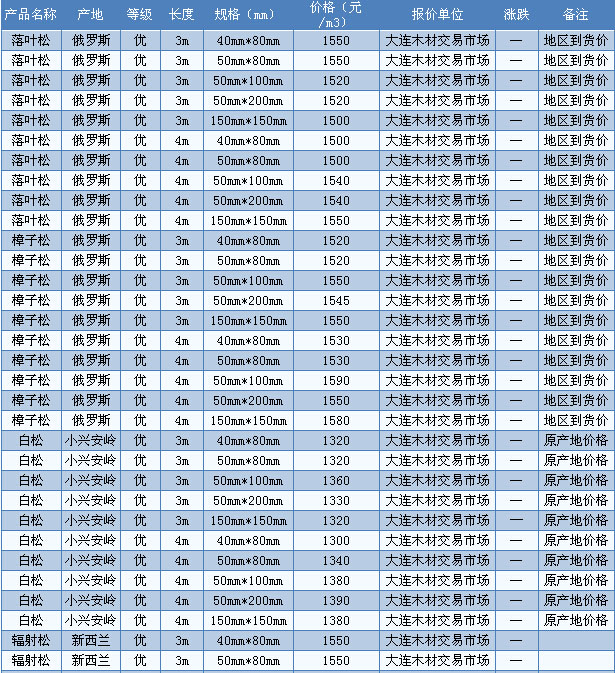 木材市場(chǎng)聯(lián)盟新動(dòng)態(tài):最新統(tǒng)計(jì)數(shù)據(jù)顯示,上半年綏芬河口岸進(jìn)口原木217.5 萬立方米,比上年同期增加15.9%。價(jià)格方面,目前樟子松原木選材價(jià)格報(bào)900元/立方米,一二等材760元/立方米,三等材680元/立方米;落葉松 原木選材830元/立方米,選材760元/立方米,三等材680元/立方米;落葉松原木直徑14-20cm、一等材750元/立方米,一二等材720元 /立方米,三等材680元/立方米;白松原木一二等材760元/立方米、三等材710元/立方米。