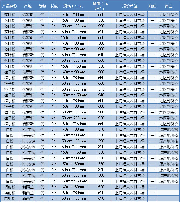 木材市場聯(lián)盟新動態(tài):2016 年中國市場針葉材原木進口量大幅增加,而俄羅斯作為中國木材第一進口大國,其原木進口量也隨大勢出現(xiàn)明顯增加??诎秲r格方面,目前滿洲里白松 14-20cm為650元/方,綏芬河740元/方,太倉950元/方。樟子松滿洲里14-20cm為620元/方,綏芬河700元/方,太倉28cm以 下820元/方。落葉松滿洲里14-20cm為660元/方,綏芬河700元/方,太倉930元/方。