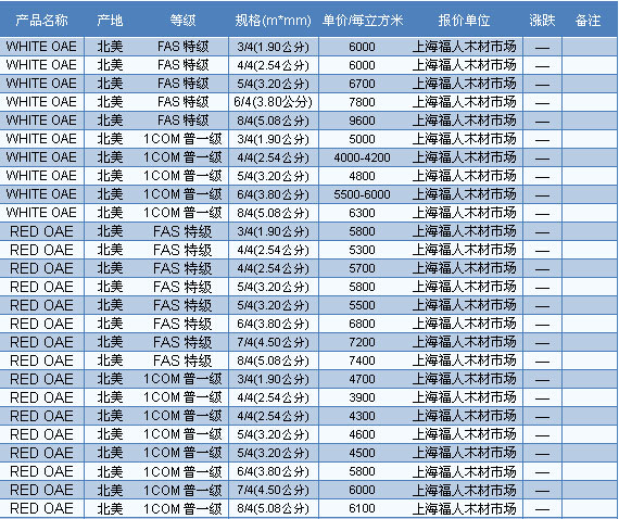 木材市場(chǎng)聯(lián)盟新動(dòng)態(tài):北美木材市場(chǎng)表現(xiàn)較為穩(wěn)定,整體形勢(shì)未見明顯的起色。商家表示主要是由于目前市場(chǎng)旺季氛圍并不是特別濃厚有關(guān)。而從現(xiàn)階段的行情來看,白栓、紅橡的表現(xiàn)依舊較為出色,出貨量較大,而高端材種則持續(xù)低迷震蕩,行情毫無起色。目前廣東市場(chǎng)櫻桃長2.15—3.05m、厚1—2寸、FAS級(jí)報(bào)價(jià)8500—12000元/立方米;硬楓木長2.15—3.05m、厚1—2寸、FAS級(jí)8000—10000元/立方米。