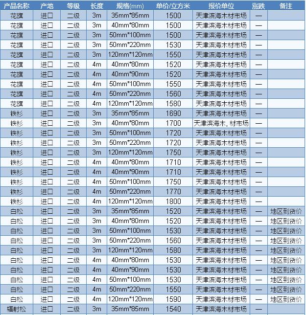 木材市場(chǎng)聯(lián)盟新動(dòng)態(tài):2016 年中國(guó)市場(chǎng)針葉材原木進(jìn)口量大幅增加,而俄羅斯作為中國(guó)木材第一進(jìn)口大國(guó),其原木進(jìn)口量也隨大勢(shì)出現(xiàn)明顯增加??诎秲r(jià)格方面,目前滿洲里白松 14-20cm為650元/方,綏芬河740元/方,太倉950元/方。樟子松滿洲里14-20cm為620元/方,綏芬河700元/方,太倉28cm以 下820元/方。落葉松滿洲里14-20cm為660元/方,綏芬河700元/方,太倉930元/方。