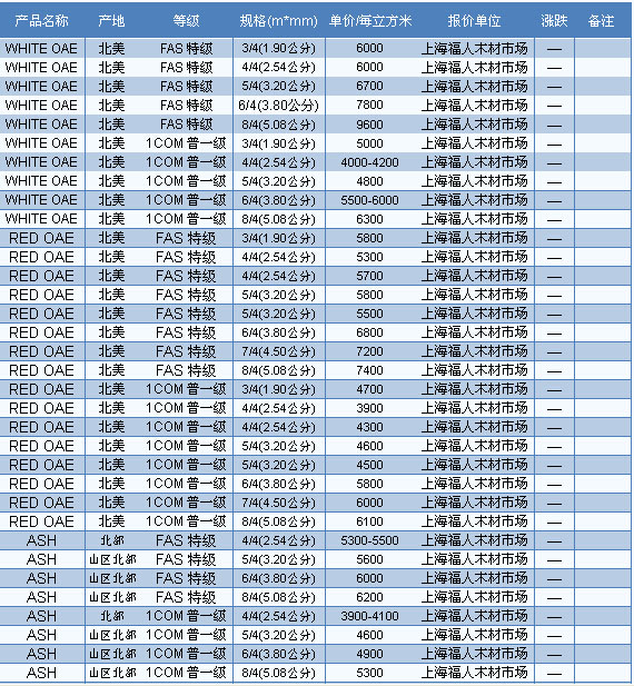木材市場聯(lián)盟新動態(tài):近期,因傳統(tǒng)旺季回暖有限,北美木材市場依然沒有明顯的好轉(zhuǎn),多數(shù)種類品種出貨量均維持在較為低迷的態(tài)勢。而且,隨著進貨價格的下滑,北美部分木材價格出現(xiàn)些許的下跌。其中如紅橡,近期價格出現(xiàn)了200元/立方米的回落。目前廣東市場紅橡長2.15—3.05m、厚1—2寸、FAS級報價7000—8800元/立方米。