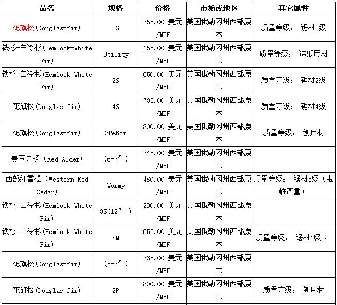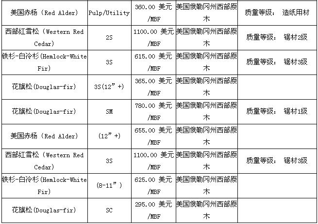 2016年10月美國西部紅雪松、花旗松等原木價格行情