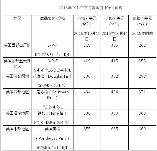 2016年10月中下旬美國當(dāng)?shù)劁彶膬r格