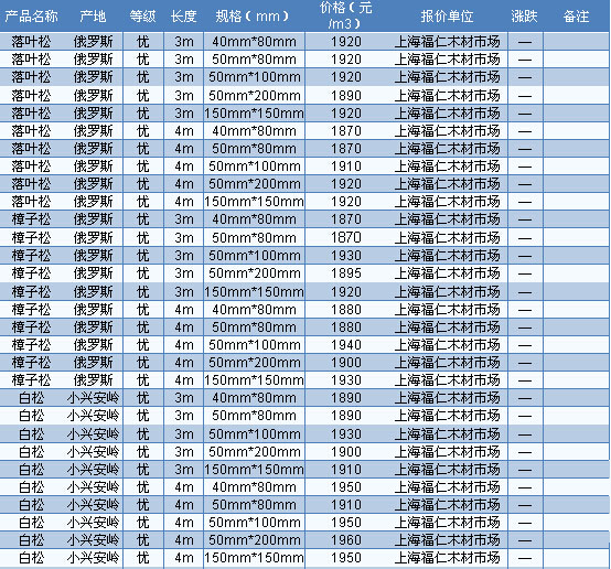 而在價格方面,目前綏芬河落葉松直徑12-14cm、加工材報至670元/立方米,直徑16-20cm、加工材報700元/立方米,直徑20cm以上、加工材報至850元/立方米。白松平均直徑24cm,一二等材報980元/立方米,加工材報850元/立方米;樟子松平均直徑24cm,一二等材報950元/立方米,選材報1150元/立方米,加工材報900元/立方米。