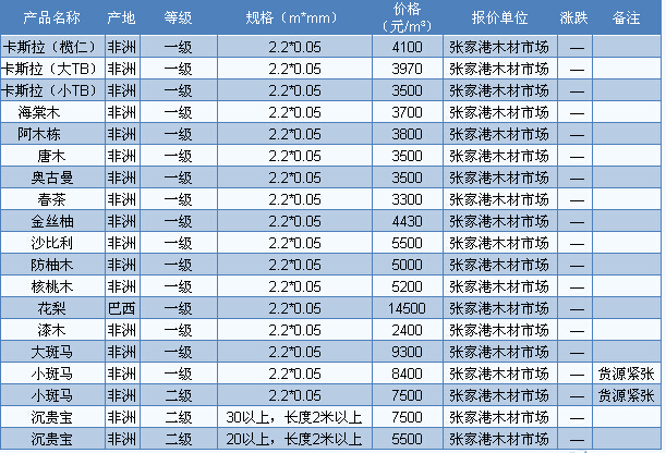 卡絲拉低位難振。據(jù)商家反映,卡絲拉難顯去年的火旺行情,由于今年卡絲拉的質(zhì)量整體較去年要差一些,加之樓市的持續(xù)低迷,對(duì)卡絲拉造成了較為嚴(yán)重的沖擊,出貨量因此受阻。目前廣東市場卡絲拉長2.2—2.6m、厚5cm、A級(jí)報(bào)價(jià)4400—4600元/立方米。