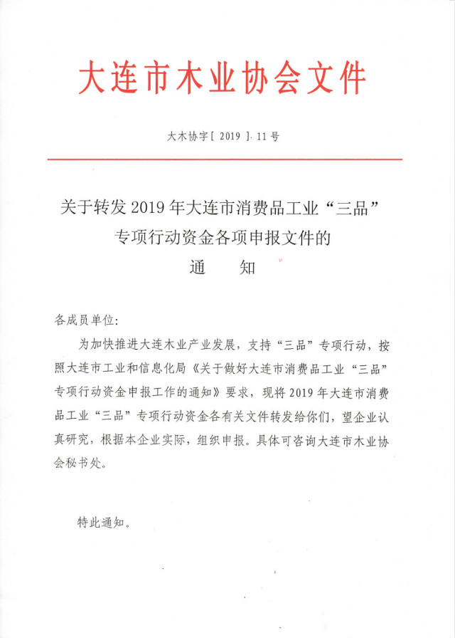 關(guān)于轉(zhuǎn)發(fā)2019年大連市消費(fèi)品工業(yè)“三品” 專項(xiàng)行動(dòng)資金各項(xiàng)申報(bào)文件的通知