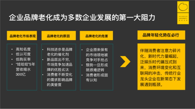 其一,品牌老化重要的市場表現(xiàn)是,可能企業(yè)知名度很高,但是如果你的產(chǎn)品不去促銷推廣,很難賣出去,比如眾所周知的“娃哈哈”,5年?duì)I收縮水300億。而好的產(chǎn)品、網(wǎng)紅產(chǎn)品,放在任何一個(gè)地方,年輕人看到就會購買。