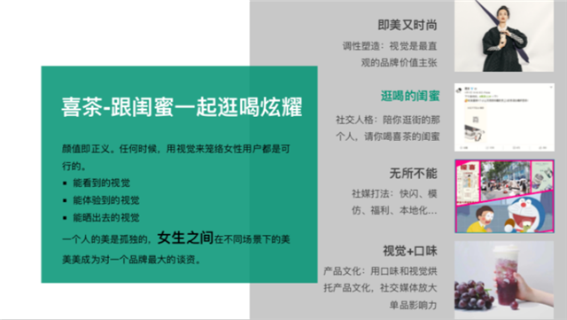 現(xiàn)在很多飲品包括很多網(wǎng)紅產(chǎn)品都在學(xué)習(xí)喜茶這種社交媒體的宣傳風(fēng)格,這對女孩子有強(qiáng)烈的沖擊力,因?yàn)榕⒆雍烷|蜜在一起最喜歡的就是曬美的事物,所以說針對女性用戶的產(chǎn)品,無論是產(chǎn)品的設(shè)計(jì)、產(chǎn)品的研發(fā),還是產(chǎn)品的宣傳,一定要有一個(gè)“美”的通道與用戶接觸。