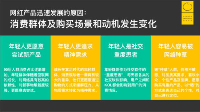 年輕人喜歡嘗試新產(chǎn)品,年輕群體伴隨著互聯(lián)網(wǎng)的成長,對網(wǎng)絡(luò)具有較高的依賴性,對新事物敏感度較強(qiáng),更喜歡去嘗試;年輕人追求精神需求,成長在富足時(shí)代的年輕群體,消費(fèi)觀與老一輩具有較大的差異,他們更愿意通過購物的方式來緩解壓力,從物質(zhì)需求轉(zhuǎn)化為精神需求;年輕人幾乎都是社交重度患者,年輕人每天大部分時(shí)間都在刷抖音、B站等,被各種社交軟件影響;年輕人很容易被網(wǎng)絡(luò)種草,年輕人對產(chǎn)品價(jià)格不敏感,但對品質(zhì)要求高,而且年輕人喜歡小眾、個(gè)性的產(chǎn)品及品牌,愿意購買有趣的產(chǎn)品,以“曬”的方式來表達(dá)自己的個(gè)性,對自己進(jìn)行定位。這是網(wǎng)紅產(chǎn)品迅速發(fā)展的原因。