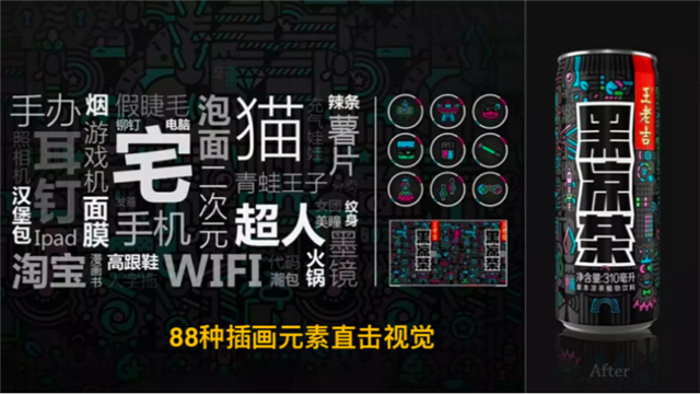 王老吉涼茶在做宣傳時(shí),用了很多插畫元素,比如宅、貓、超人、wifi等等,這都是年輕人喜歡的網(wǎng)絡(luò)語言。當(dāng)你用一些網(wǎng)絡(luò)語言時(shí),很多的年輕人一眼就看到了你的產(chǎn)品。