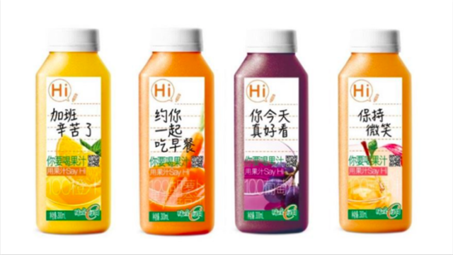 味全果汁把一些標(biāo)簽打到飲料瓶上,通過這種方式可以在一個(gè)貨架上很明顯看到它和別的飲料是不同的,而且還可以把飲料當(dāng)作追女孩的神器。