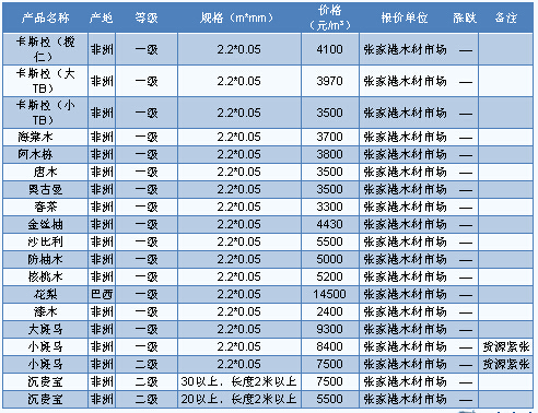 卡絲拉貨源緊缺。據(jù)商家反映,經(jīng)過了大半年的消耗,近期卡絲拉的貨源較為緊缺。另外,據(jù)了解雖然目前緬甸地區(qū)雨季已經(jīng)停止,但是砍伐工作尚未開始。在這種情況下,卡絲拉的貨源緊缺問題將會(huì)持續(xù)很長(zhǎng)的一段時(shí)間。目前廣東市場(chǎng)卡絲拉長(zhǎng)2.2—2.6m、厚5cm、A級(jí)報(bào)價(jià)4500—4600元/立方米。