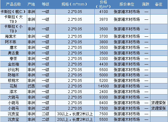 近期,非洲鋸材市場表現(xiàn)依舊低位平穩(wěn),行情無明顯的變動。據(jù)商家反映,臨近年底,非洲木材整體的銷量無好轉(zhuǎn)的跡象,這表明了今年非洲材市場將不再有回暖的可能。價格方面,近期非洲材價格基本平穩(wěn)。